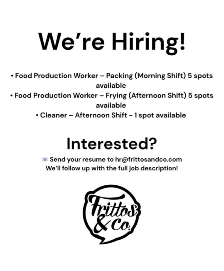 NOW HIRING: Frying Production Workers (Afternoon Shift)